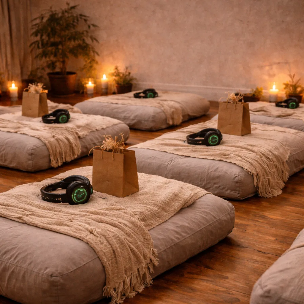 You are held by the group energy without being pulled out of your own experience by it. The headphones keep you inside your own journey, which is exactly where the work happens.