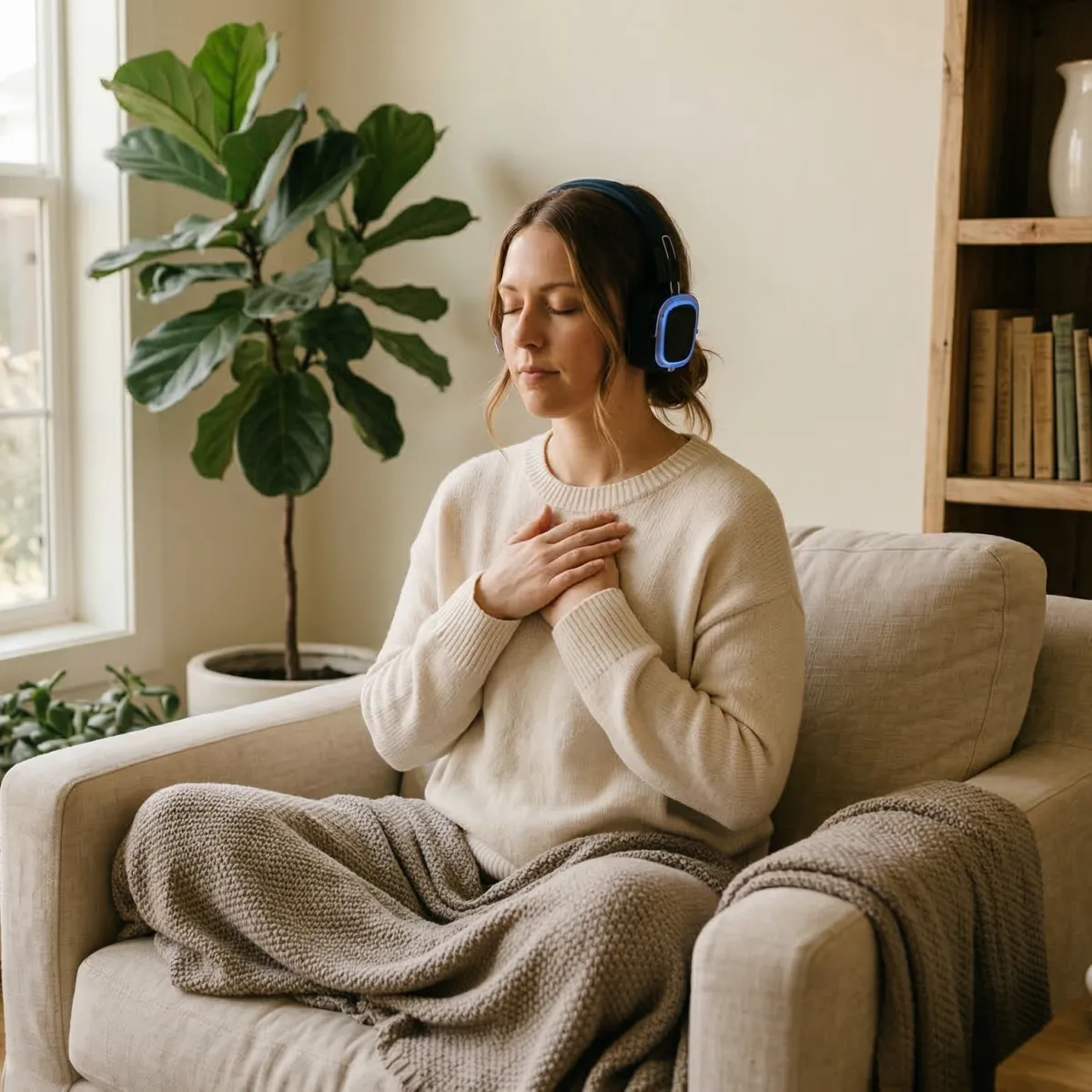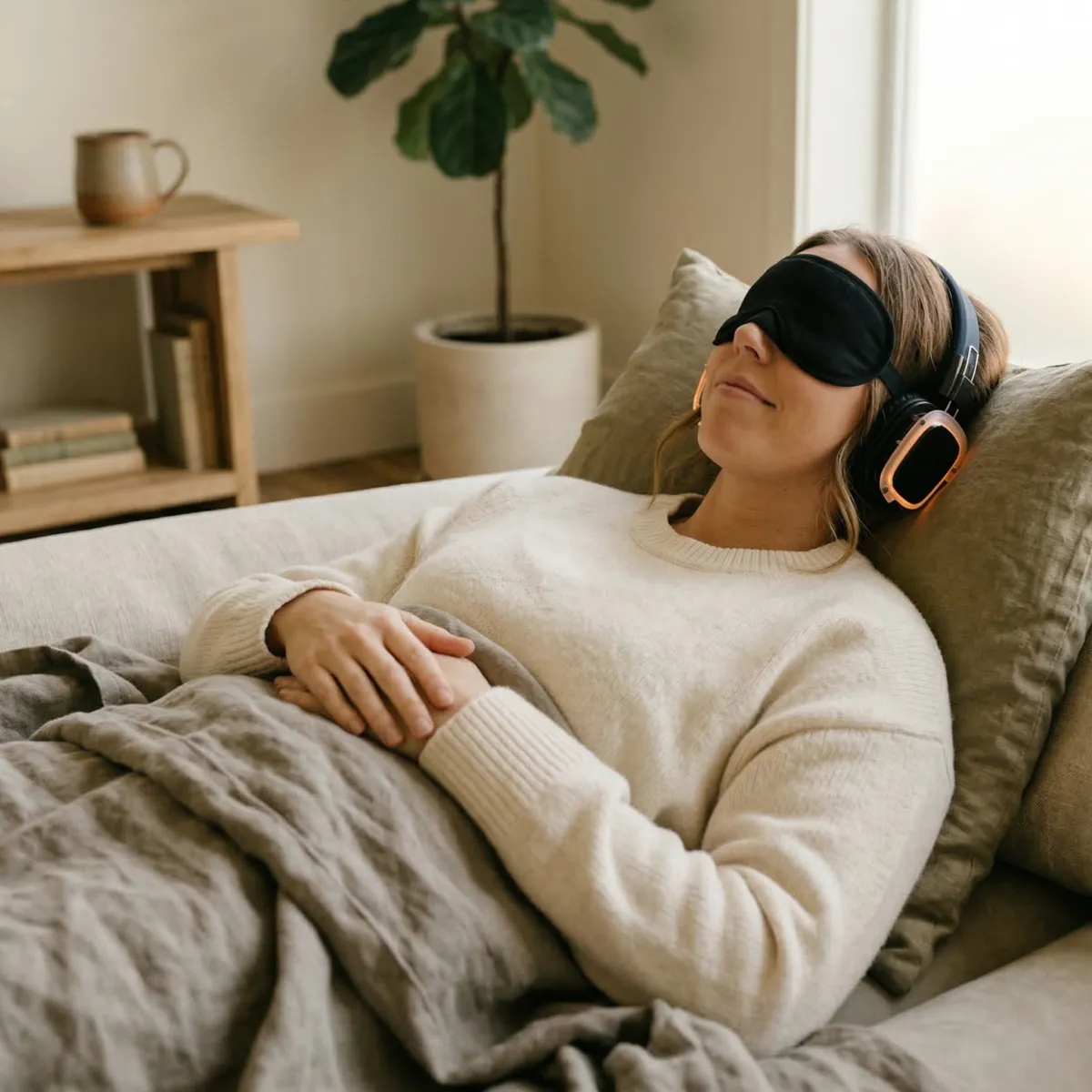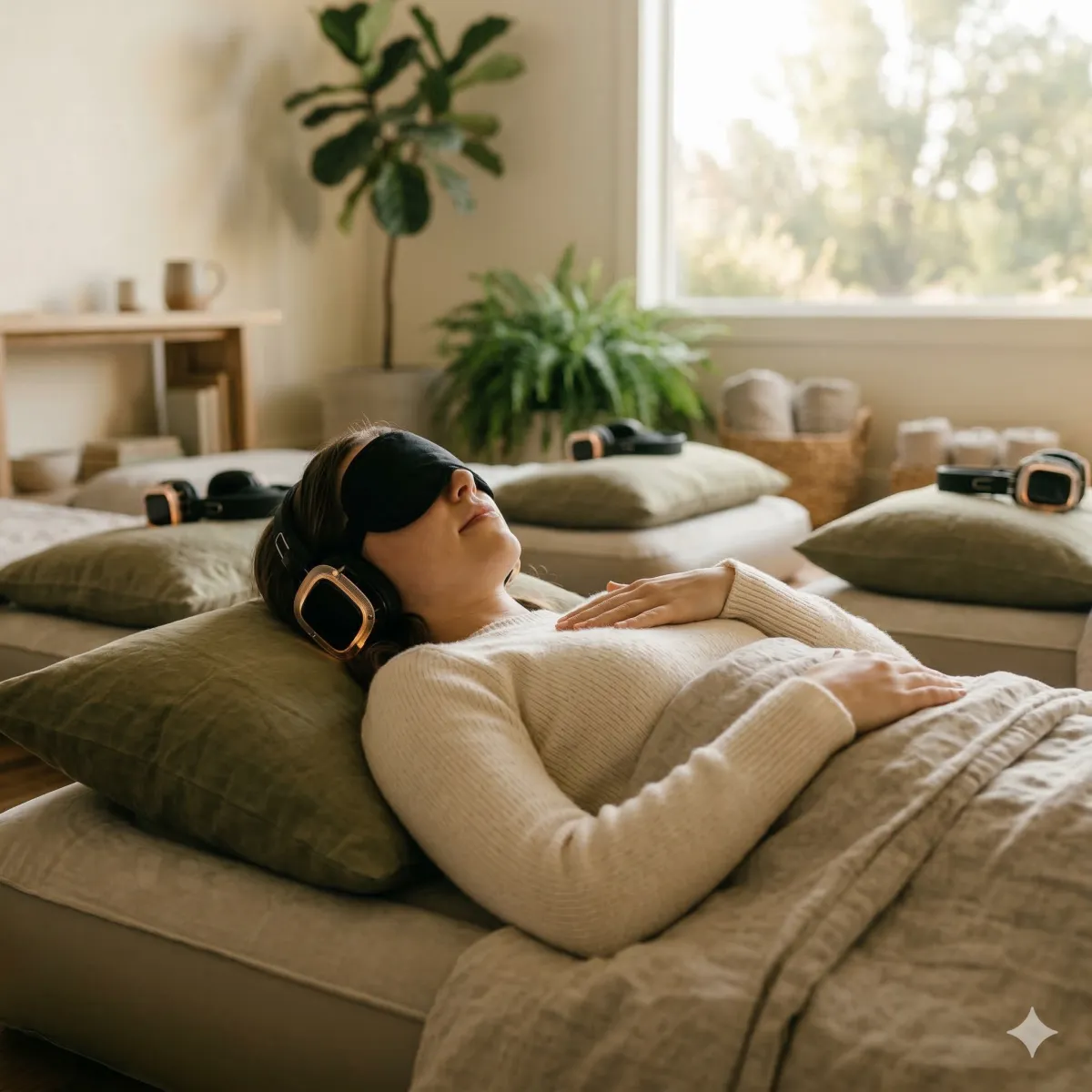 You lie down with headphones and an eye mask. Simple breathing at the start helps your body arrive and your mind begin to quiet. There is nothing to figure out. You just land.