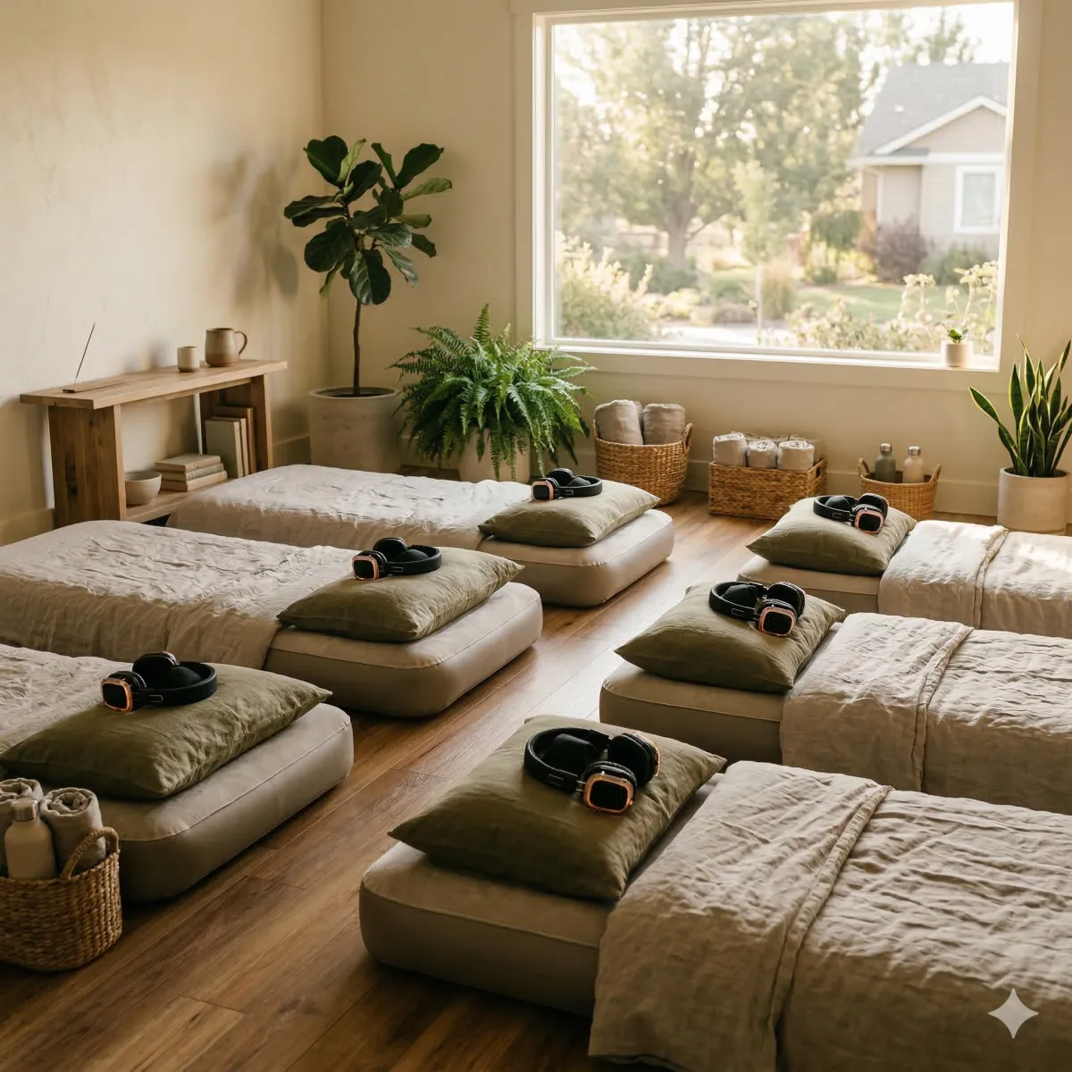You’ll lie comfortably on a twin air mattress with headphones and an eye mask. The session begins with simple breathing to help your body relax and settle into the experience.